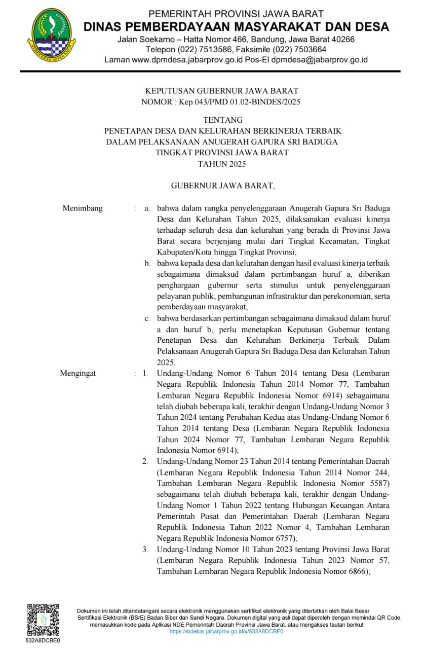 Dalam surat keputusan GUBERNUR JAWA BARAT Nomor : Kep.043/PMD.01.02-BINDES/2025 Tentang Penetapan Desa dan Kelurahan Bekinerja Terbaik Dalam Pelaksaan Anugerah Gapura Sri Baduga Tahun 2025, Desa Cangko menjadi Salah satu desa terpilih di kecamatan tukdana sebagai peraih penghargaan tersebut yang mana penghargaan ini merupakan kegiatan gubernur jawa barat dalam evaluasi kinerja terhadap seluruh desa dan kelurahan yang berada di provinsi jawa barat secara berjenjang mulai dari tingkat kecamatan, tingkat kabupaten/kota hingga tingkat provinsi. ajang ini menilai mulai dari tata kelola pemerintah, pembangunan, dan pelayanan publik untuk apresiasi desa/kelurahan berkinerja terbaik, dengan penilaian meliputi aspek administrasi, pemaparan, hingga verifikasi lapangan. dengan ini kepala desa/kuwu cangko H. CASNADI,SE. mengucapkan terimakasih banyak kepada gubernur jawa barat H. DEDI MULYADI, SH. atas peghargaan tersebut, hal ini pun tidak terlepas dari kinerja terbaik para jajaran pemerintah desa cangko dan juga dukungan dari pemerintah kecamatan tukdana karena pada dasarnya semua ini untuk kepentingan kemajuan desa. Penulis: MAHRUS